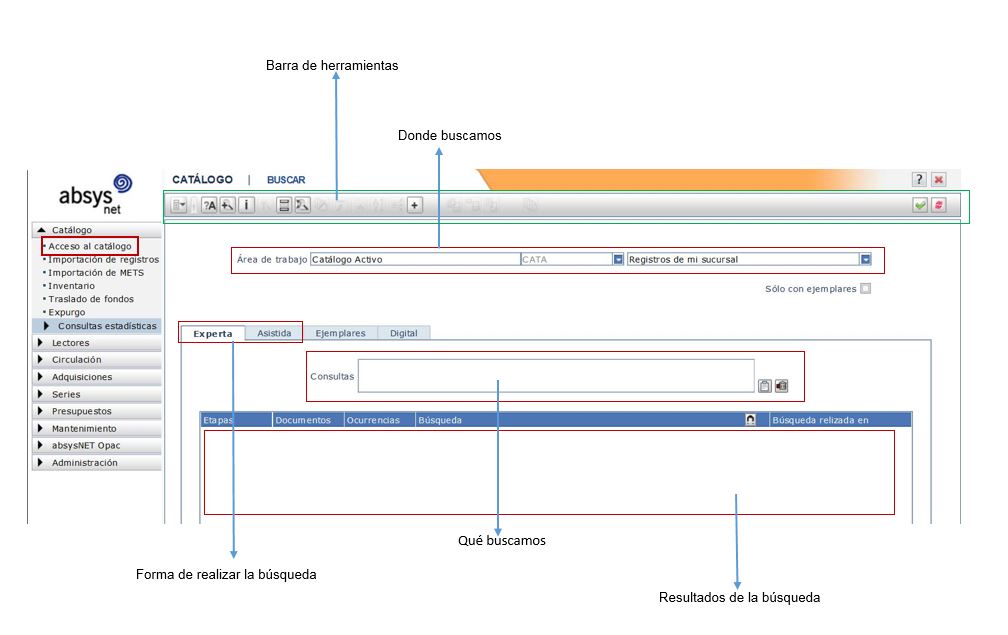 El primer módulo es el catálogo. Accedemos haciendo clic en el Catálogo y luego en Acceso al Catálogo. En él se encuentran todos los registros y los ejemplares de la Red, no solo los de nuestra biblioteca.