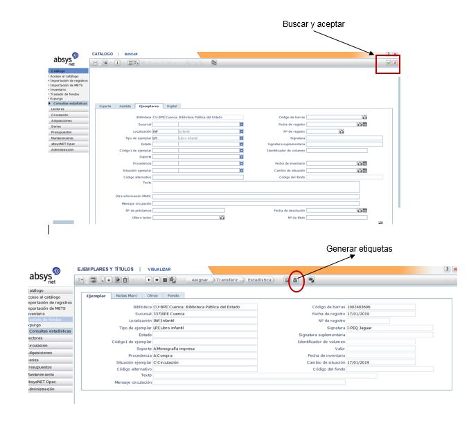 - El campo Tipo de ejemplar, permite seleccionar uno a uno los distintos materiales de cara a cambiar el formato de código/ para poner en la impresora la hoja de tejuelos del color correspondiente a cada material.