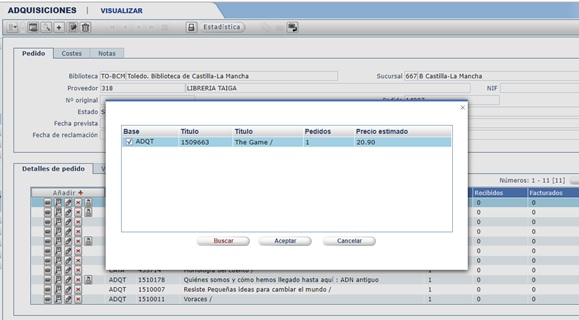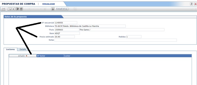 Una vez recuperado el registro de CATA + ADQT + CANC, de alguna base de datos externa, o añadido uno nuevo mediante una PRECATALOGACIÓN, introduciremos el precio estimado y pulsaremos el botón de validar. La propuesta de compra ya habrá quedado registrada en nuestra base de datos.