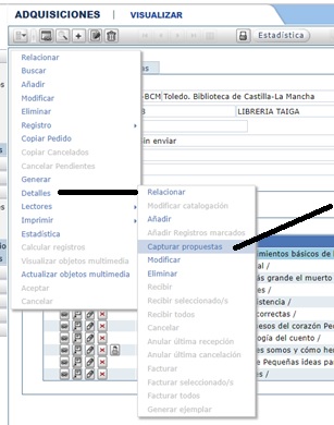 - Gestión de Adquisiciones (recuperamos o creamos un pedido) > Desplegamos el menú (botón situado en la parte superior izquierda) > Detalles > Capturar propuestas (introducimos el número secuencial de la propuesta).