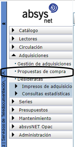 La herramienta PROPUESTAS DE COMPRA nos permite añadir registros a la base de datos de Absysnet, para posteriormente incorporarlos a un pedido. Cuando la propuesta se incluya en un pedido, ésta desaparecerá automáticamente de la base de datos. Si no la incorporamos a ningún pedido, se quedará en nuestra base de datos hasta que la eliminemos de manera manual.