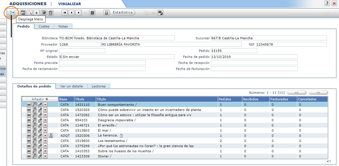 Una vez que hemos recuperado el pedido que queremos generar, pulsamos el botón DESPLIEGA MENÚ.
