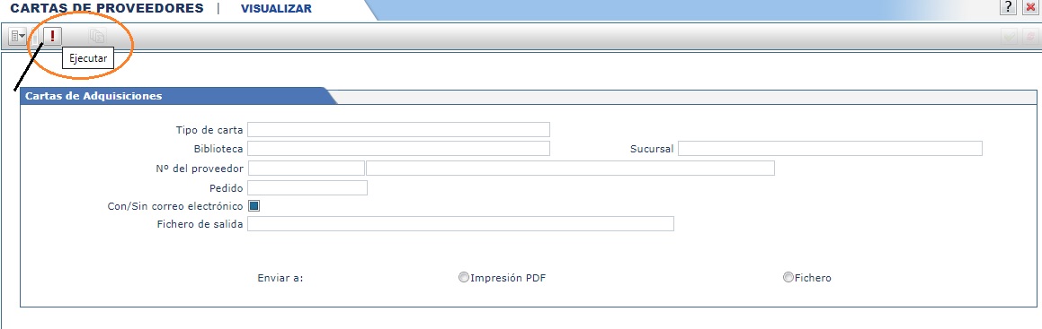 En la siguiente pantalla pulsaremos el botón EJECUTAR (símbolo de admiración rojo), que activará la pantalla para introducir el número del pedido cuya carta queremos generar.