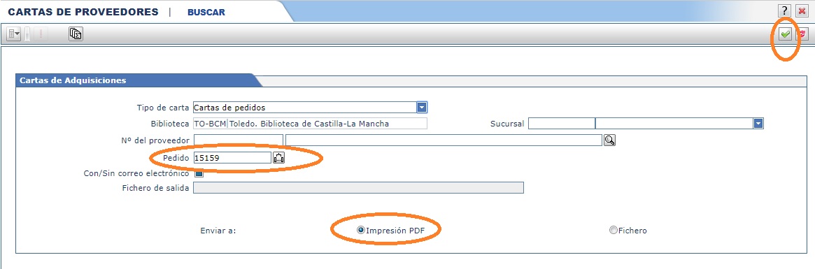 Además del número de pedido, comprobaremos que está marcada la opción IMPRESIÓN PDF, y que en el campo TIPO DE CARTA está seleccionada la opción CARTAS DE PEDIDOS. El campo BIBLIOTECA se rellenará automáticamente. Si todo está correcto, hacemos clic en el aspa verde de VALIDAR.