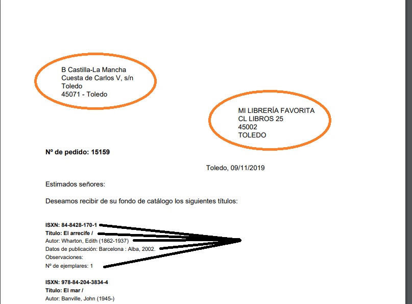- El ISBN de cada uno de las obras incluidas en el pedido, el título, los datos de publicación y el número de ejemplares que pedimos.