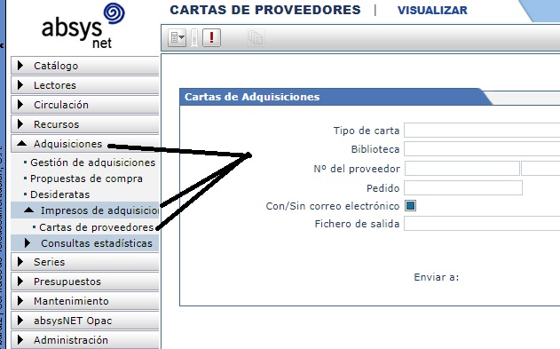 - Menú jerárquico de la izquierda > Pestaña ADQUISICIONES > Impresos de adquisiciones > Cartas de proveedores.