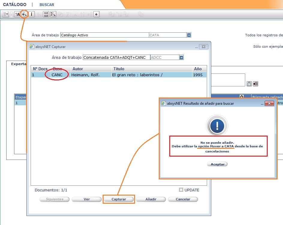 Desafortunadamente no podemos hacerlo directamente desde el resultado de la búsqueda, aunque al seleccionarlo desde Buscar para añadir, Absysnet nos dirá qué tenemos que hacer: moverlo a CATA desde la base de datos en la que esté.