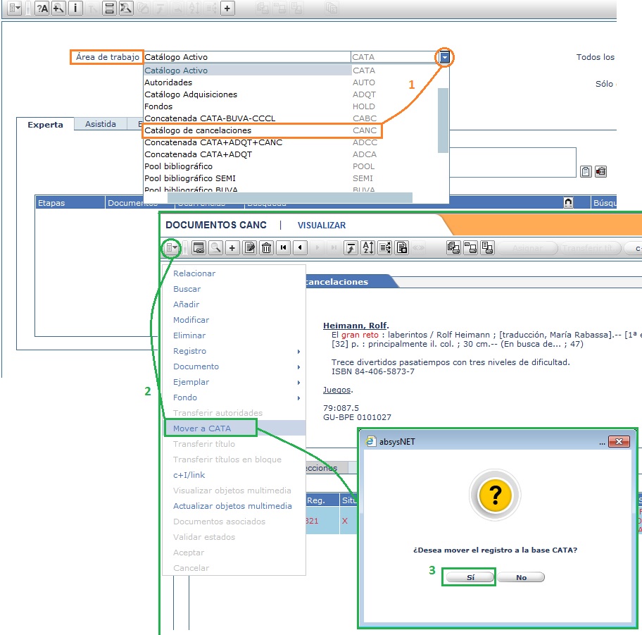 Por tanto tendremos que seleccionar la base de datos donde está el registro bibliográfico (CANC en nuestro ejemplo), buscar nuestro documento, y seleccionamos la opción Mover a CATA en el Menú del botón "Despliega menú"